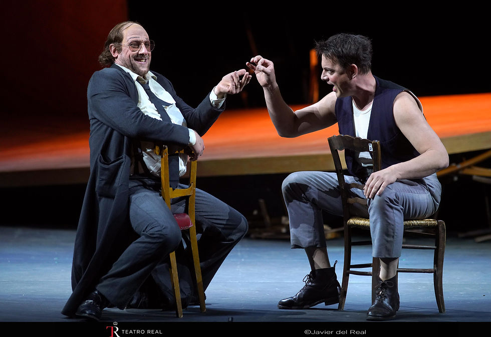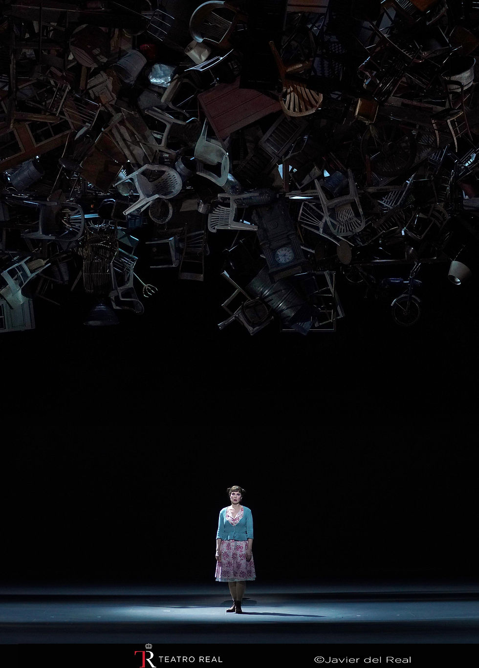 What I mean by this is evident in the first act, where the stage features only a cloud made of recycled furniture—chairs, tables, lamps, a curious grandfather clock, bicycles, wardrobes, and windows. In the second act, only a “cardboard” house is added, and in the third act, a circus tent appears. In my view, this approach to scenography is effective, as it is animated by actors dressed as clowns moving to the rhythm of the galop. All of this allows the stage design to grow progressively in presence, and when combined with the brilliant lighting by Urs Schönebaum, it results in a wonderful spectacle. As a curiosity, Bohuslav Martinů once described this opera as “the opera of human happiness,” and thanks to Laurent Pelly, that description proves fitting.