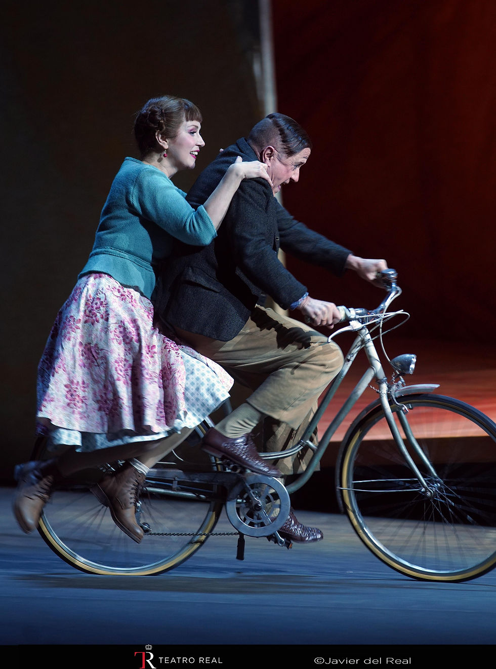 A esto me refiero porque en el primer acto lo único que se observaba en el escenario es una nube formada por muebles reciclados (sillas, mesas, lámparas, un curioso reloj de pie, bicicletas, armarios o ventanas) algo que en el segundo acto solamente se añadió al escenario una casa de “cartón” y ya en el tercer acto se mostraba una carpa de Circo. En mi criterio la manera de presentar la escenografía es acertada porque está sostenida por unos actores caracterizados de payasos al ritmo del galop. Todo ello ha hecho que la presencia de la escenografía vaya de menos a más y que si al trabajo de los escenógrafos añadimos la brillante iluminación de Urs Schönebaum tenemos un maravilloso espectáculo de una ópera que como curiosidad Bohuslav Martinů la calificó como “la ópera de la felicidad humana” y así ha sido gracias a Laurent Pelly.