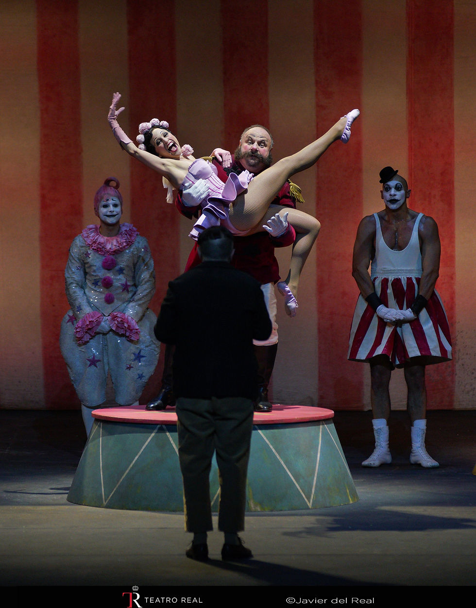 As for the orchestral work under Gustavo Gimeno, it was the highlight of the evening, alongside the theatre’s resident chorus. He interpreted the score with great ease throughout the opera. Particularly brilliant moments included the opening, with its famous overture full of rapid quavers and semiquavers, clearly showcasing the complexity and craftsmanship required of the strings in performing the intricate fugue; the polka at the end of the first act, in which the chorus participates splendidly; the furiant, which in this production appears as a transition between the first and second acts rather than opening the latter; and finally, the wonderful galop—the “Dance of the Comedians”—in the third act, which here becomes the most humorous moment on stage as the circus tent is assembled by the clowns.